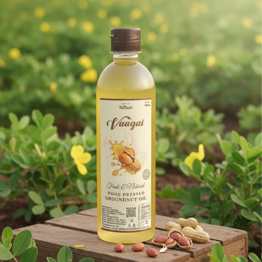 Cold-pressed in the traditional chekku method, our groundnut oil is rich in natural nutrients like Vitamin E and healthy fats. Its authentic aroma and nutty flavor make it perfect for South Indian cooking, deep frying, and even North Indian curries. 100% chemical-free, heart-healthy, and made just like in the olden days — pure taste, pure tradition.